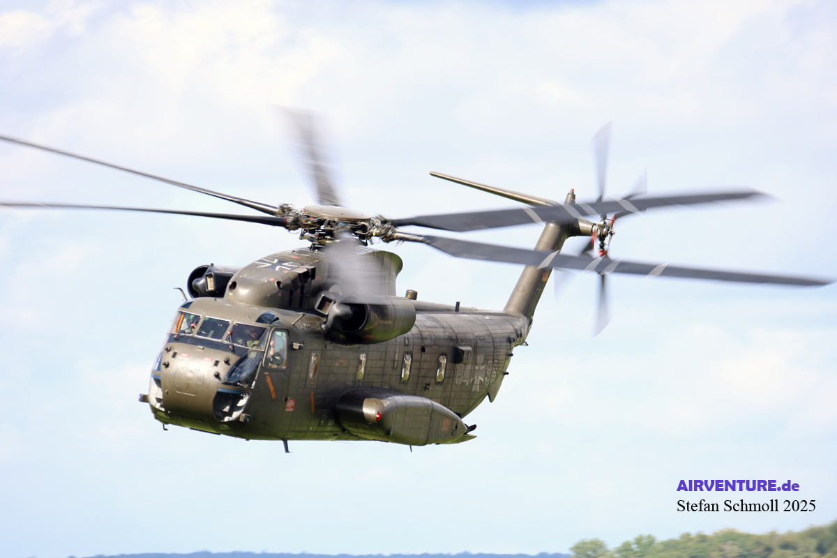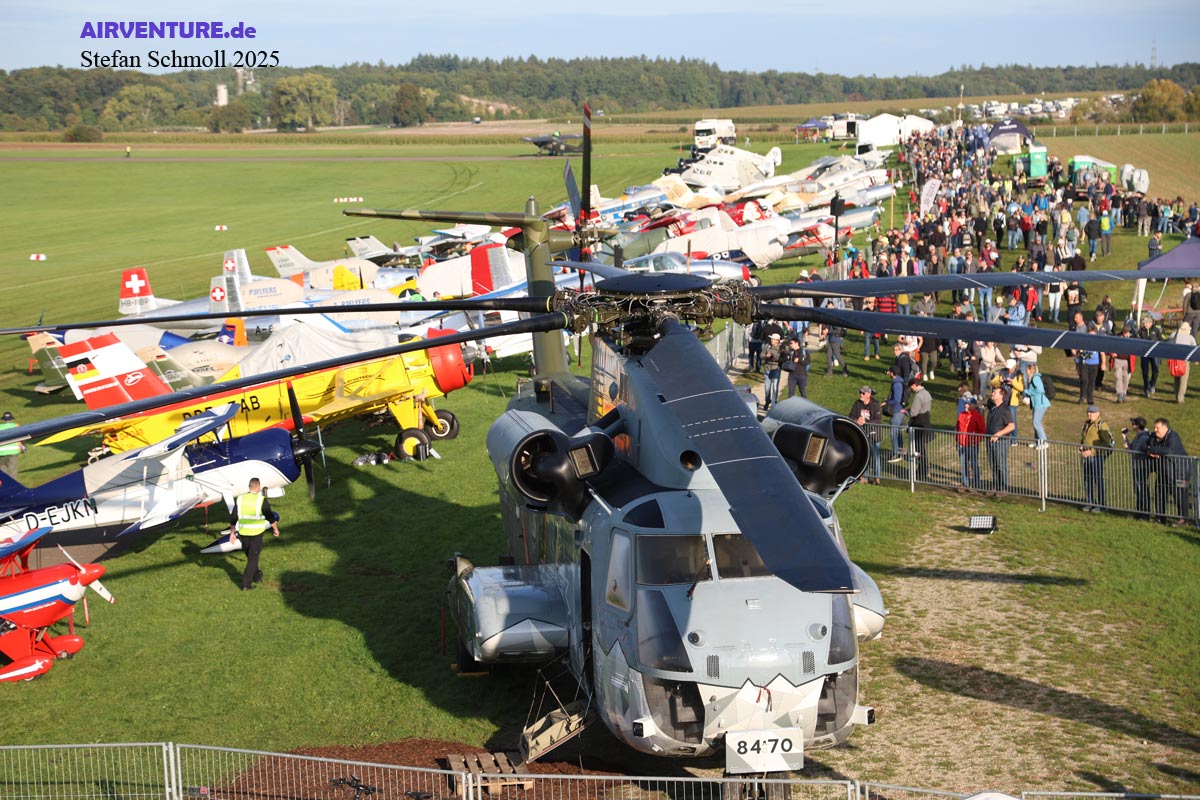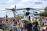 Und hier die im Einführungstext angekündigten Hubschrauber. Da staunten die angereisten Zuschauer nicht schlecht, dass gleich neben dem Sprecherturm diese Sikorsky CH-53G in ihrer Sonderlackierung zu ihrem 50. Jubiläum bei der Bundeswehr präsentiert worden ist..
