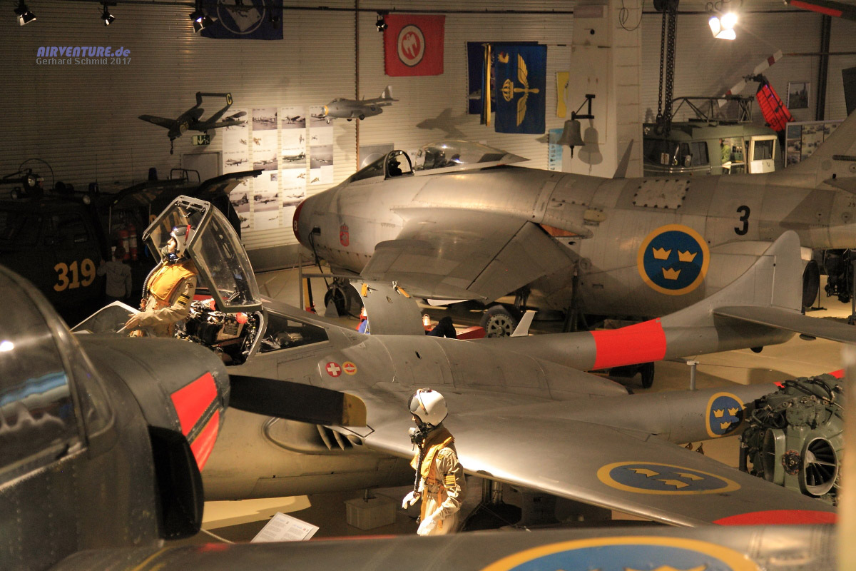 Weder die Besatzungen einer Vampire (links), noch der Pilot einer Gripen (rechs) muss den eisigen Fahrtwind fürchten. Der Besucher des Museum auch nicht. Aber letzterer bekommt eine interessante Zusammenfassung aus 100 Jahren schwedischer Militärluftfahrt geboten. |