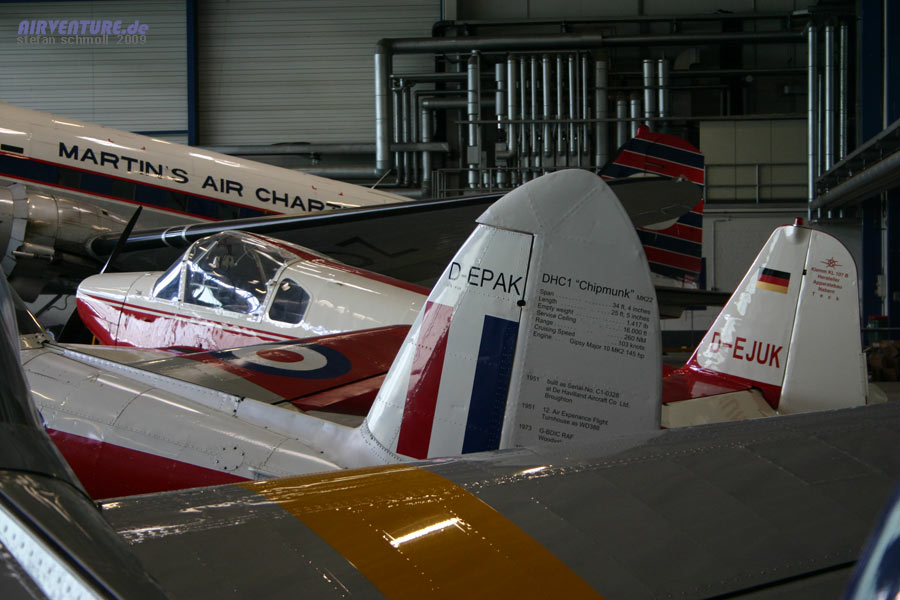 Zwei DHC.1 Chipmunk, eine Klemm 107, und eine...Douglas DC-3? Nein, die Quax-Flieger haben nicht aufgerüstet, aber im Dortmunder Winterquartier ist schon recht viel Platz. Mehr am Ende des Berichtes. |