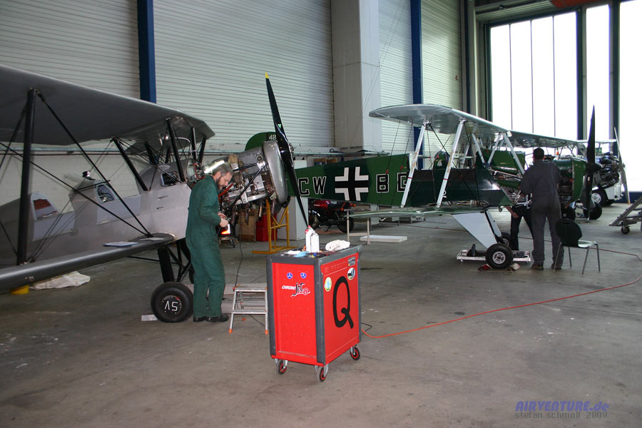 Echte Oldtimerpiloten müssen immer auch ein wenig Mechaniker sein. Kleinere Wartungsarbeiten an den Maschinen kann ja fast jeder aktive Quax ausführen. Aber einige der Mitglieder sind wahre Schrauberkönige und kennen sich in der Materie wirklich intensiv aus. |