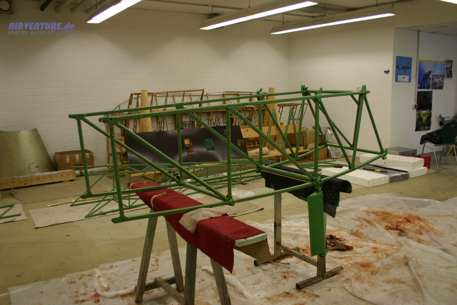 Die zentrale Einheit der Bestmann wurde aus einem Stahlrohrgerüst gefertigt. Hier wurden Flügel, Motor und der hintere Rumpf angebracht. Derzeit ist der Holzflügel der Bestmann noch in Berlin eingelagert. Er wird aber in den kommenden Monaten ebenfalls nach Dortmund transportiert werden. |