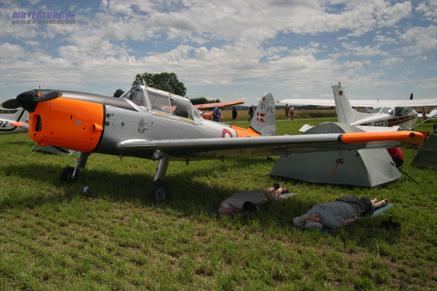 Die Besatzung der de Havilland Canada DHC-1 Chipmunk aus Dänemark gönnt sich im Schatten der Tragfläche ein Nickerchen. Die voll kunstflugfähigen Militärtrainer aus der Zeit kurz nach dem zweiten Weltkrieg sind noch recht weit verbreitet. |