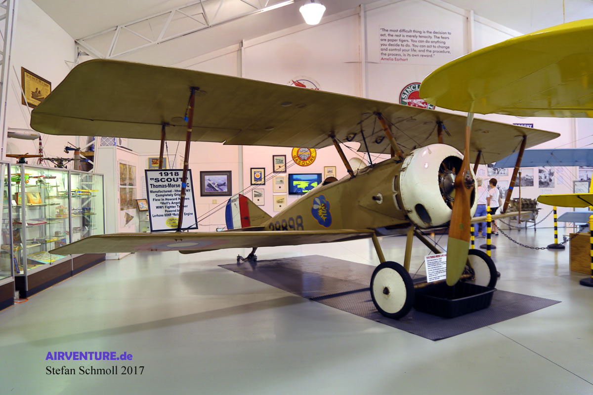 Aus dem Jahr 1918 stammt das einsitzige Trainingsflugzeug Thomas-Morse S-4 Scout. Rund ein Dutzend Exemplare haben in amerikanischen Museen die Jahrzehnte überstanden. Die N3307T ist eine wahre Zeitkapsel, denn sie befindet sich praktisch noch im Originalzustand aus der Zeit des I. Weltkrieges. |